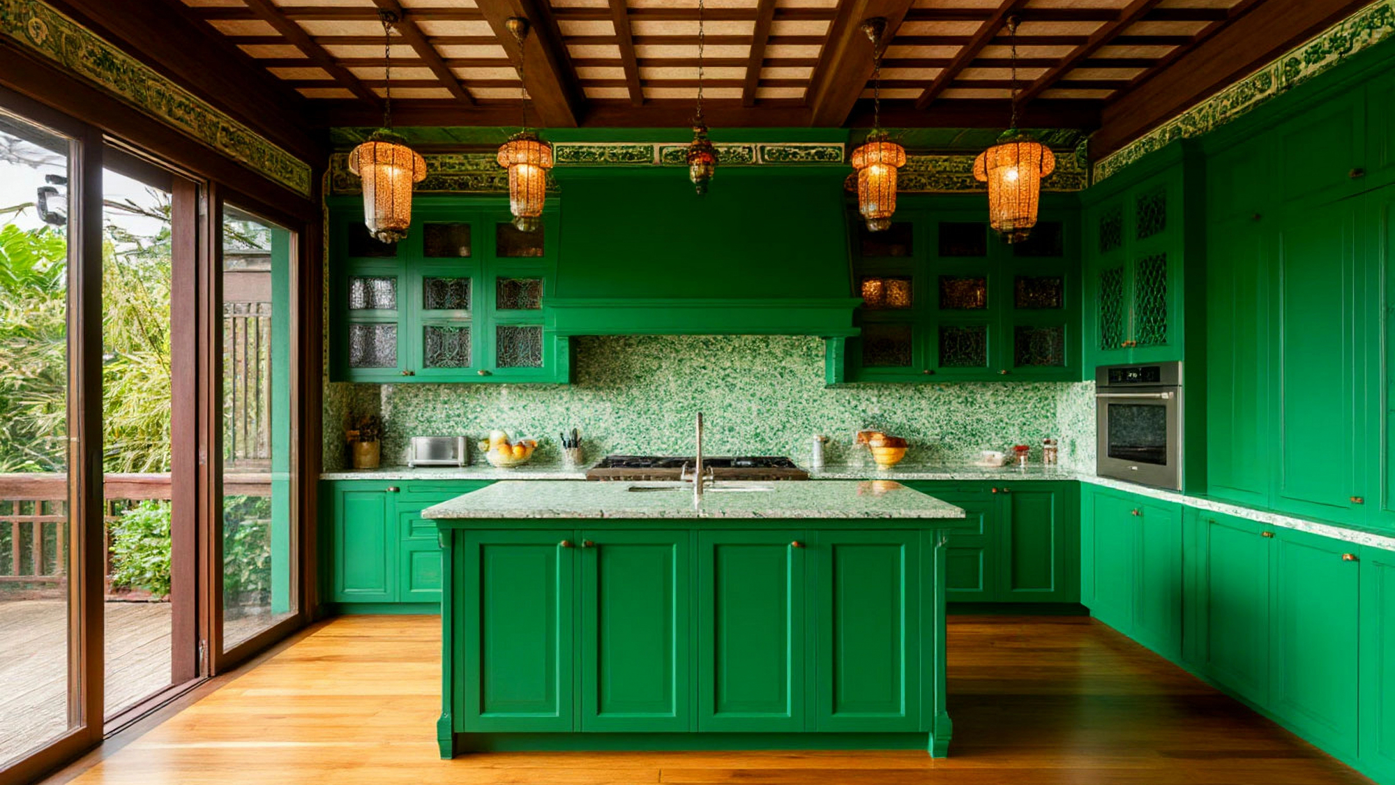 Зелёный цвет в "Малихе" играет ключевую роль. Он символизирует жизнь, рост, свежесть, но в то же время — устойчивость и традицию. Это не яркий, не кричащий оттенок, а насыщенный и мягкий, как бархат. Он кажется вечным, как сама природа. В сочетании с золотистой отделкой он приобретает тёплое, чуть медовое сияние, которое делает пространство не просто красивым, а почти священным. Когда смотришь на эту кухню, кажется, что она хранит тишину древних садов, аромат специй и утреннюю прохладу фонтанов.